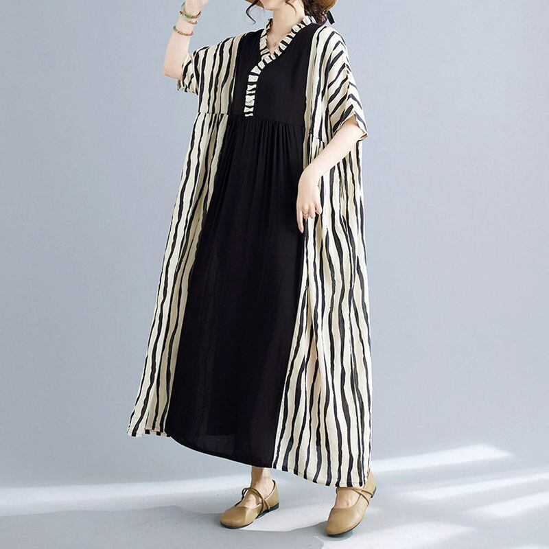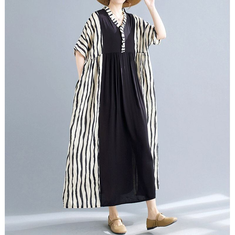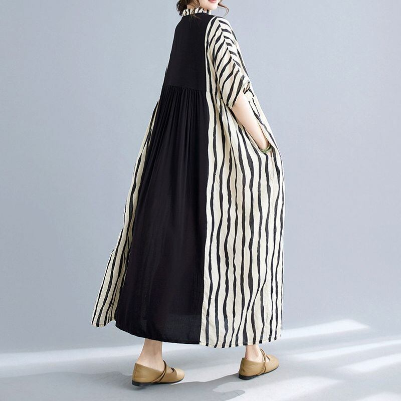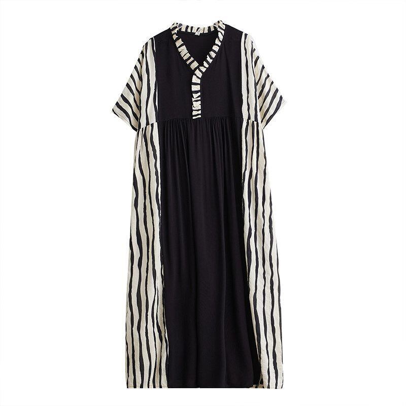 大胆なストライプとブラックの切替が印象的なワンピース。