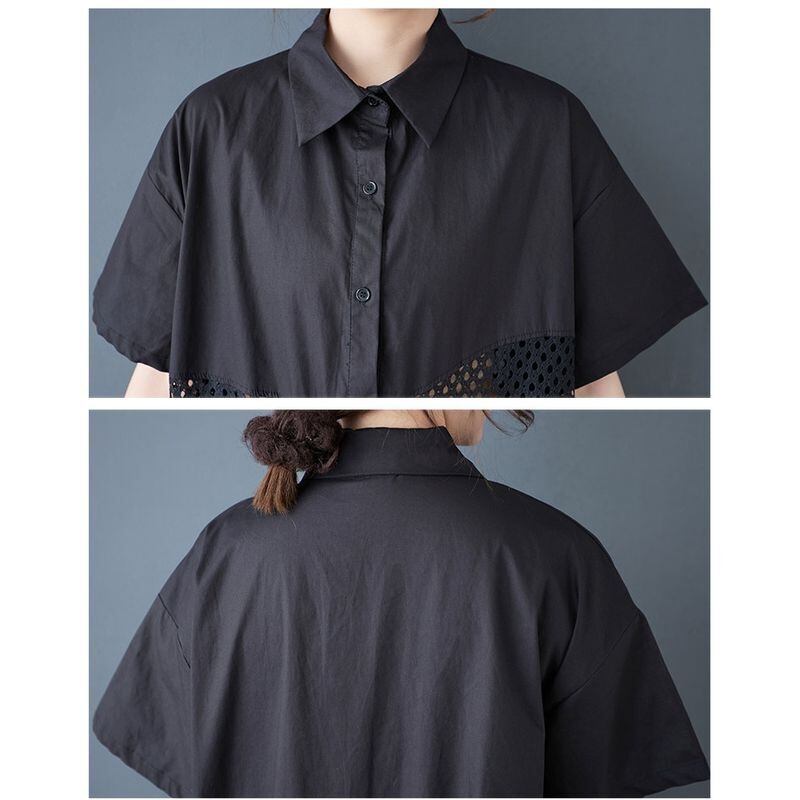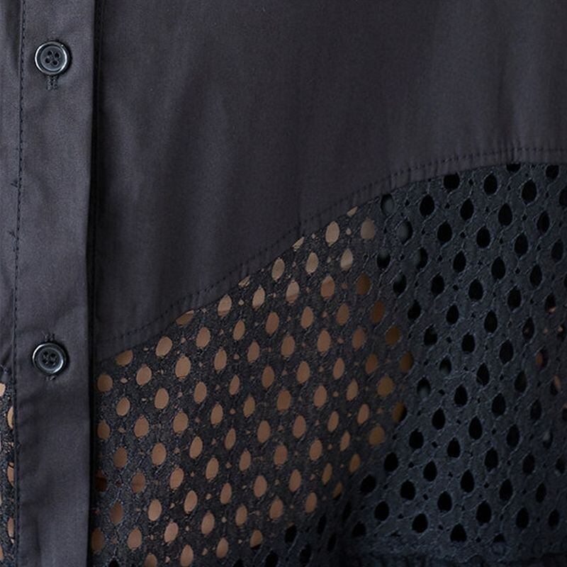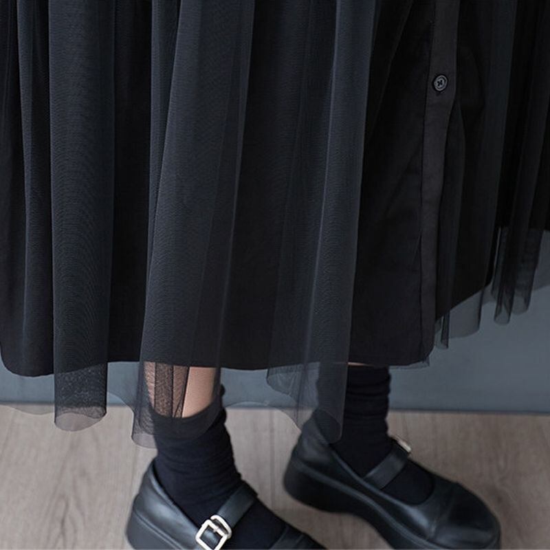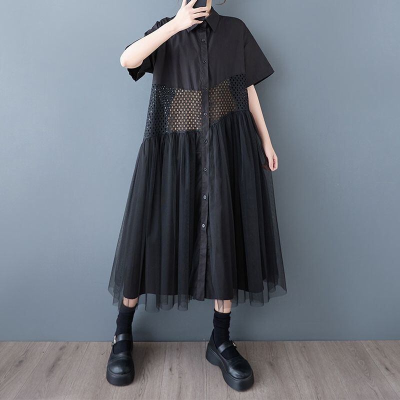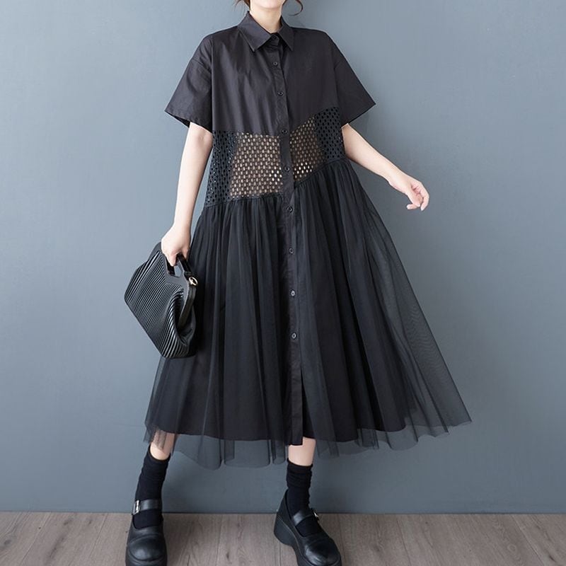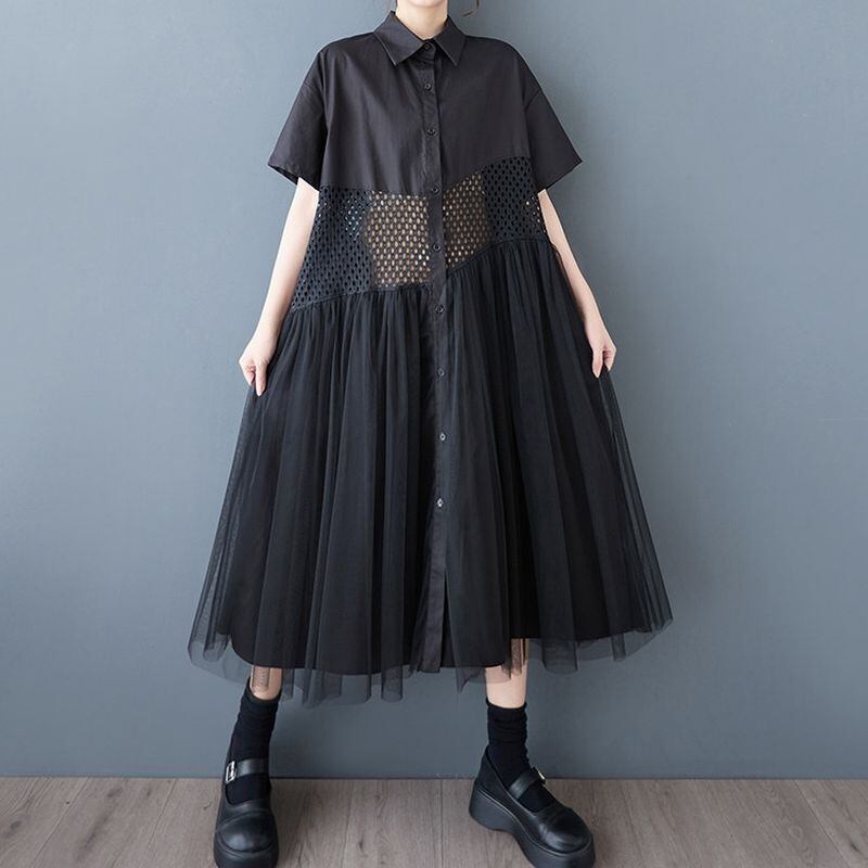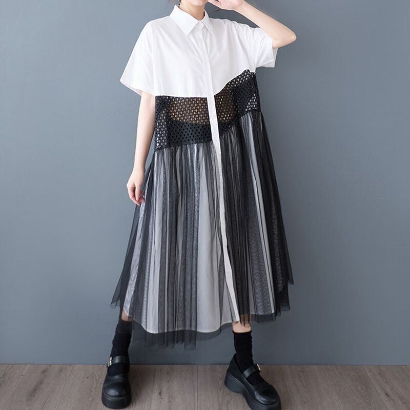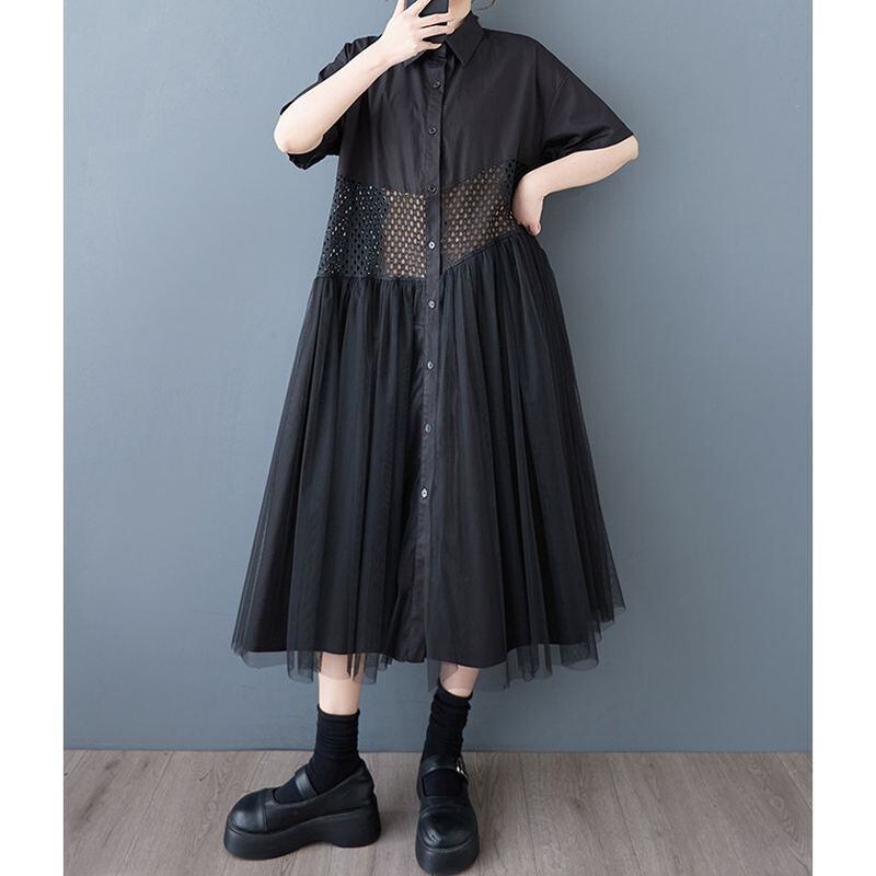 トップス部分はシャツ生地、ウエスト部分は穴あきデザイン、スカート部分はチュール素材で切り替え、一枚で存在感のあるシャツワンピース。