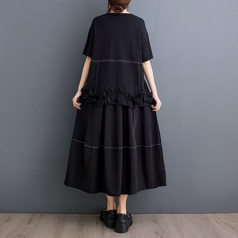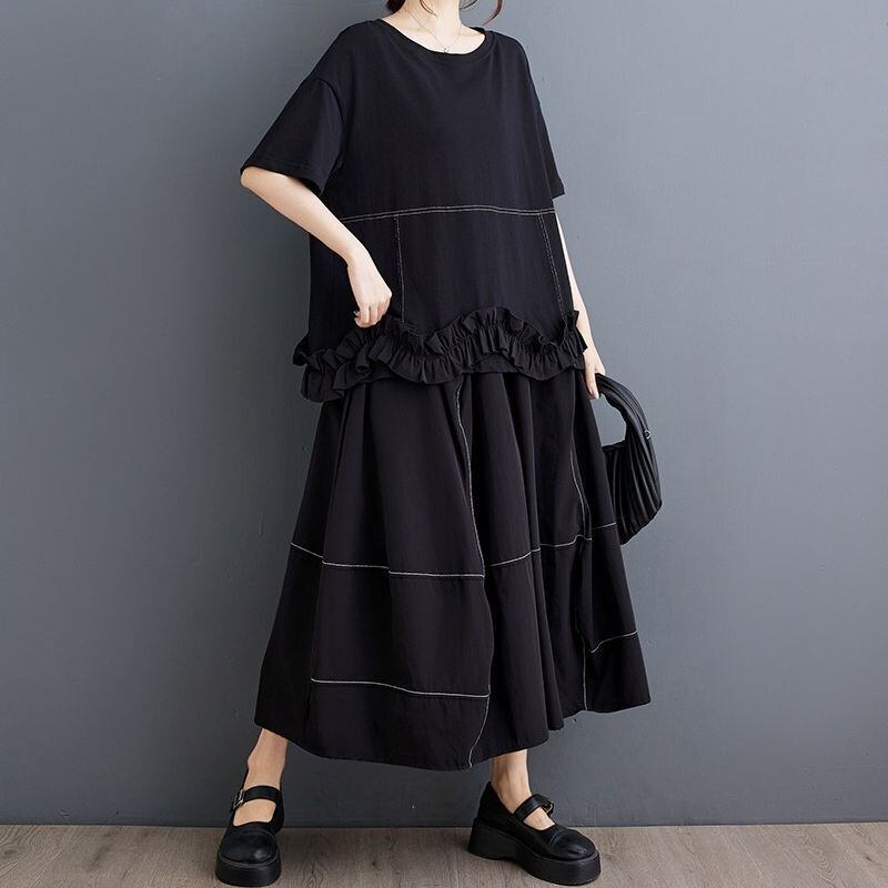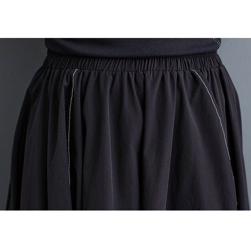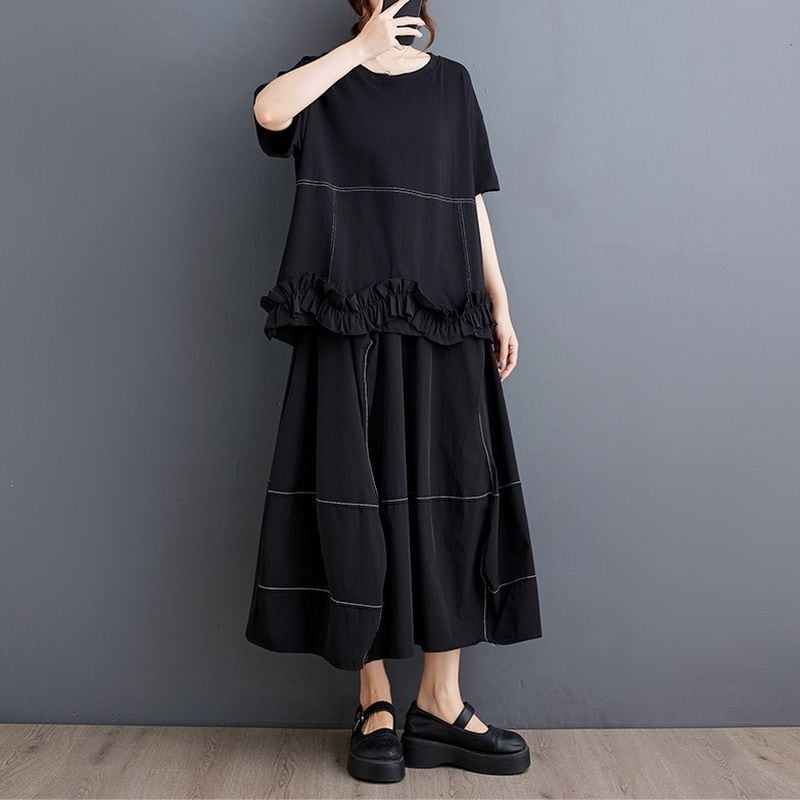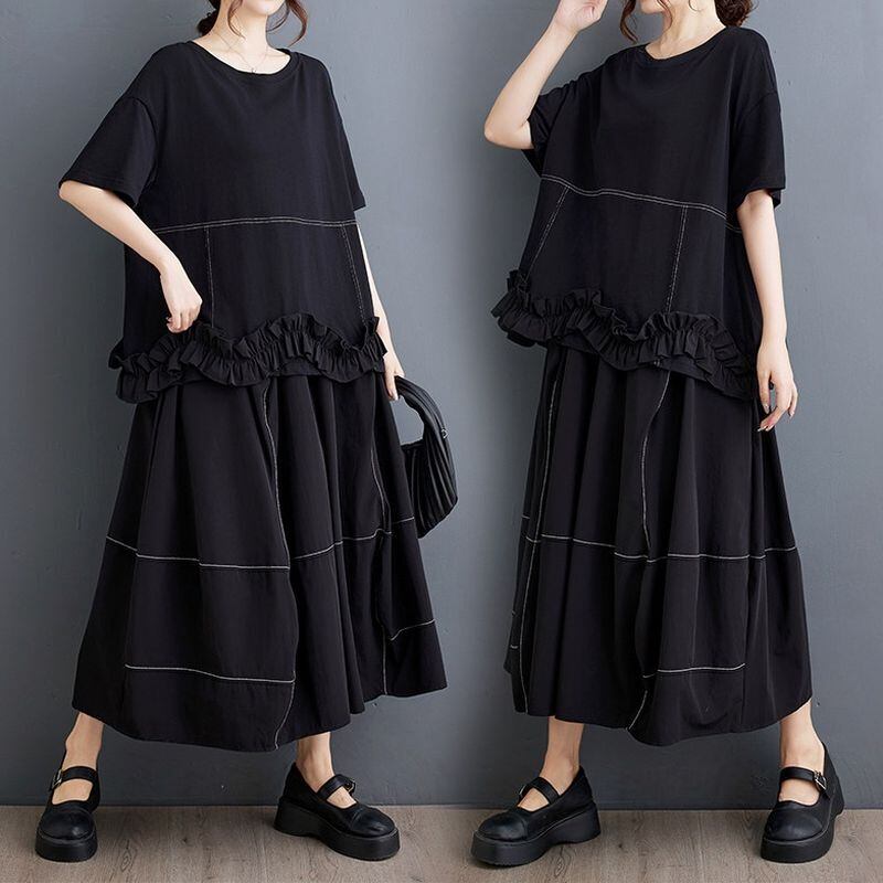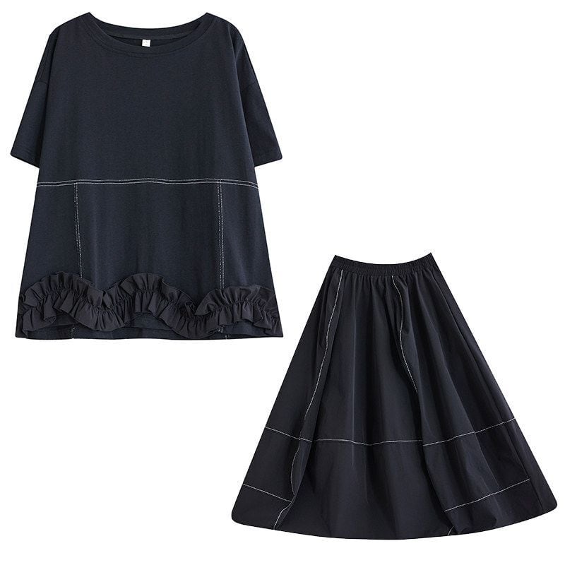 トップスのフリルとステッチデザインがアクセントになり、単調にならない印象に。