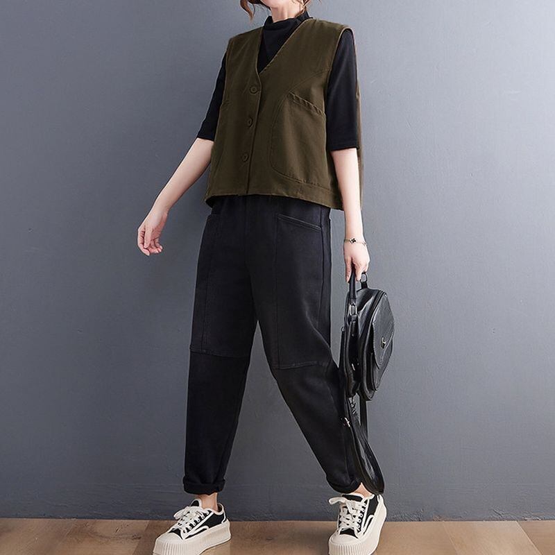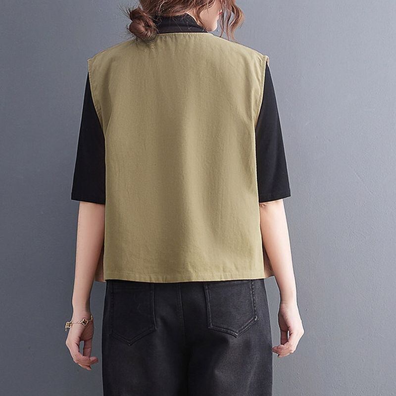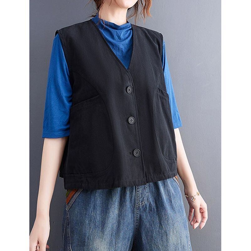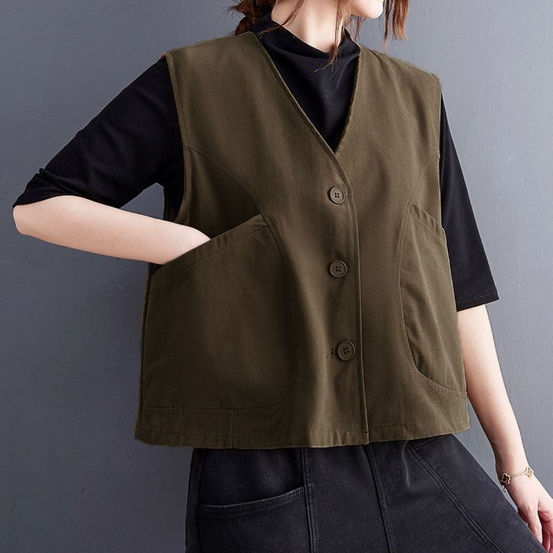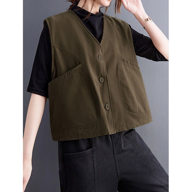 すっきりとしたVネックと、丸みのあるポケットが印象的なベストトップス。
