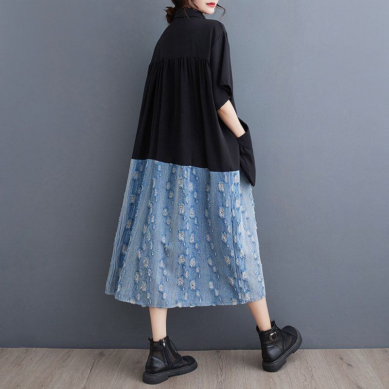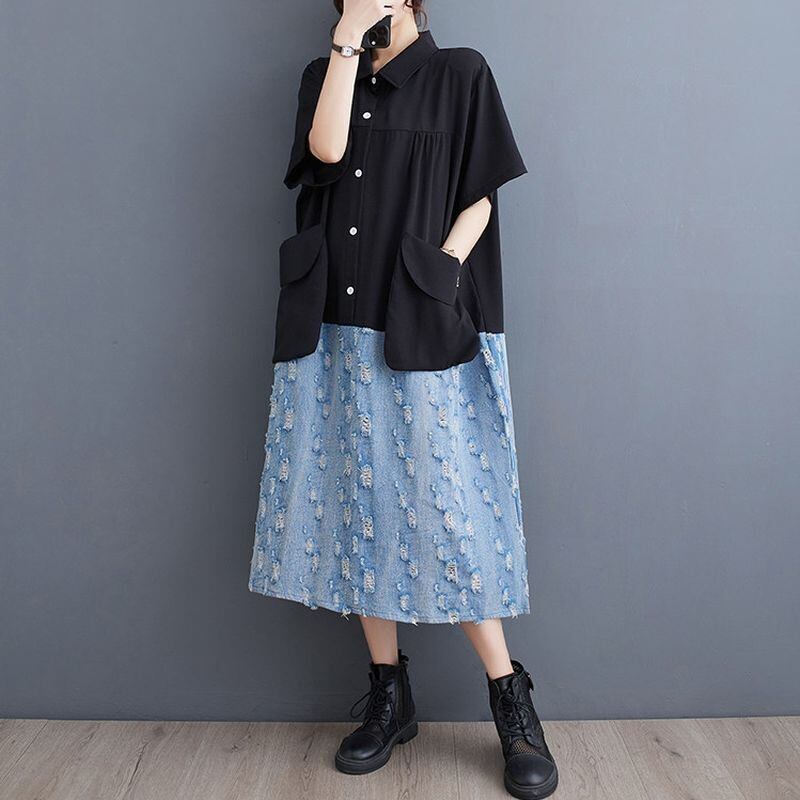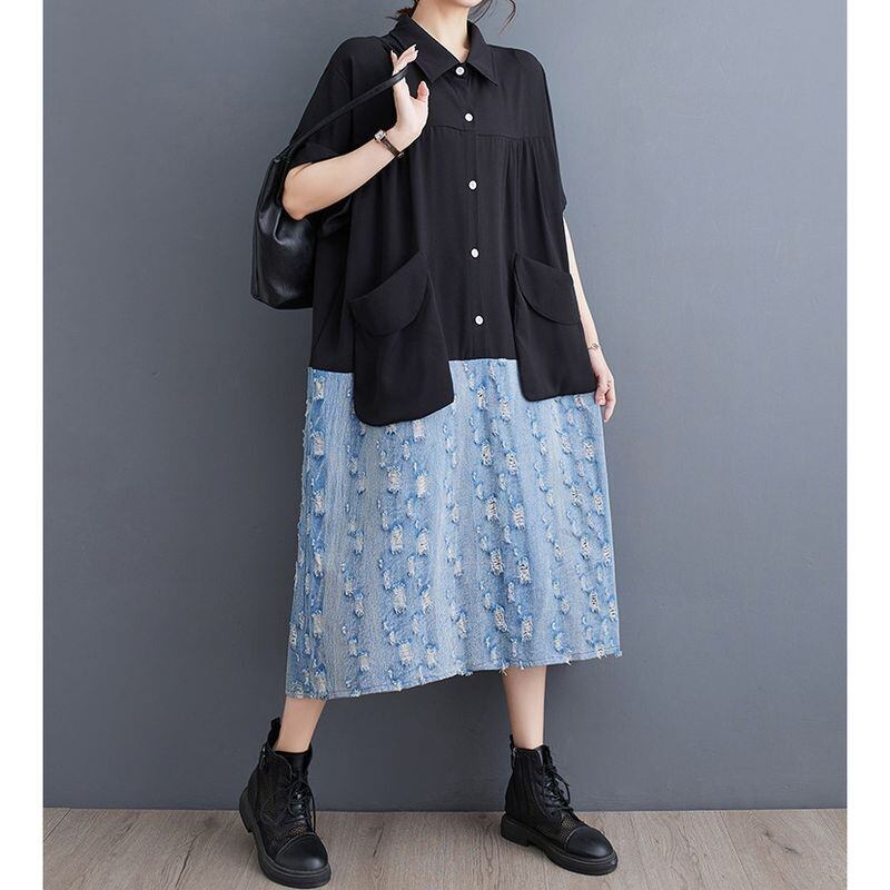シャツデザインにダメージ加工デニムを組み合わせたワンピース。