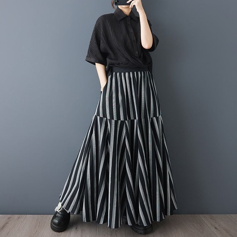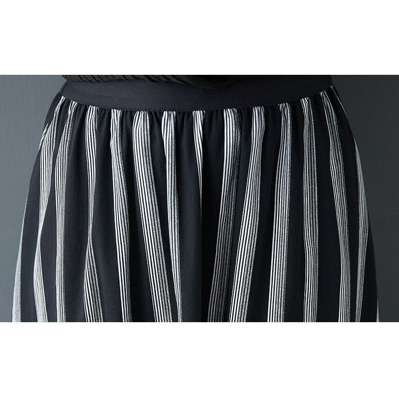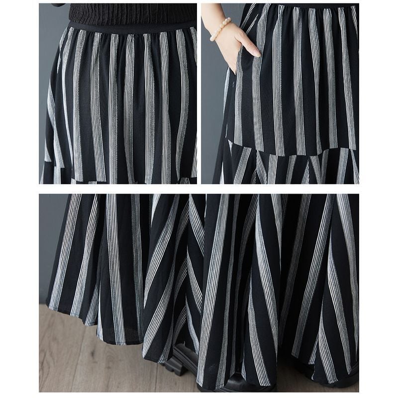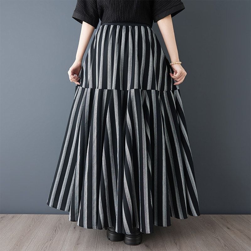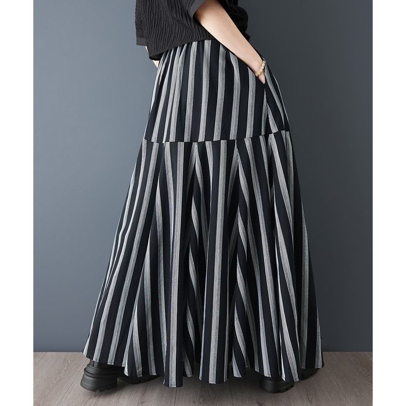 縦の配色ストライプが印象的な、すっきり見えを叶えるフレアスカート。