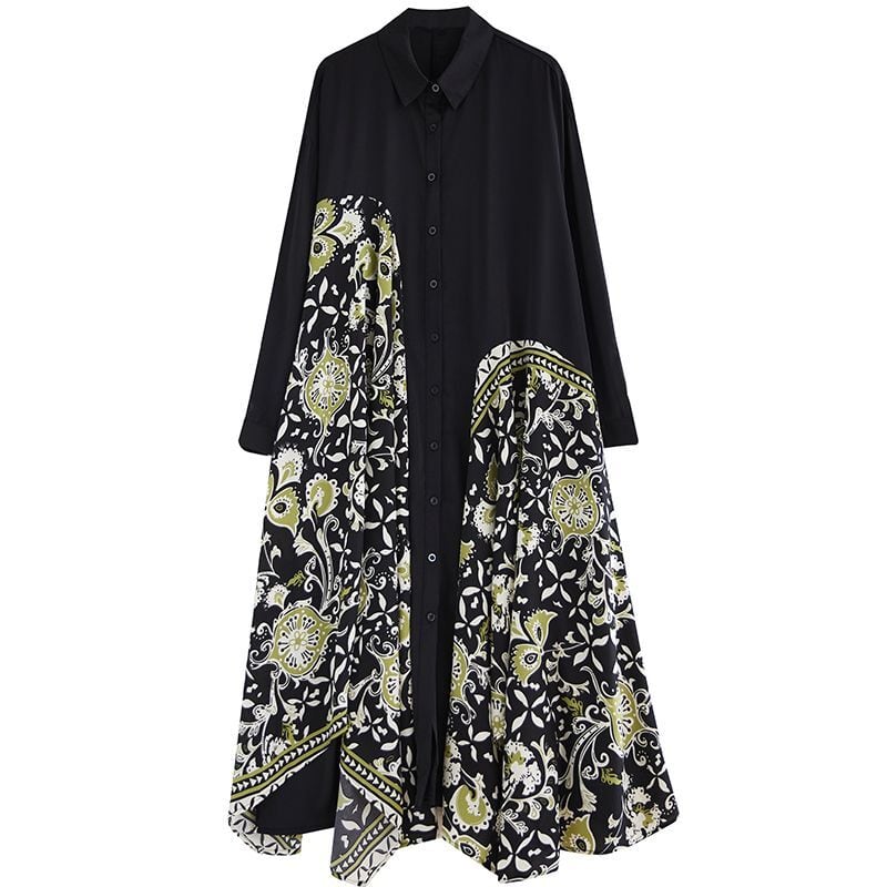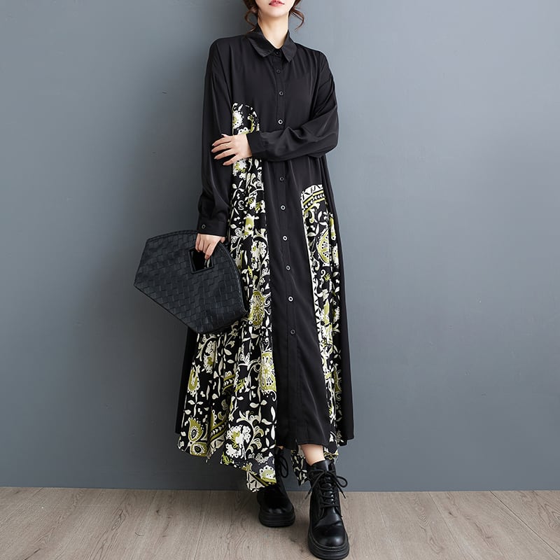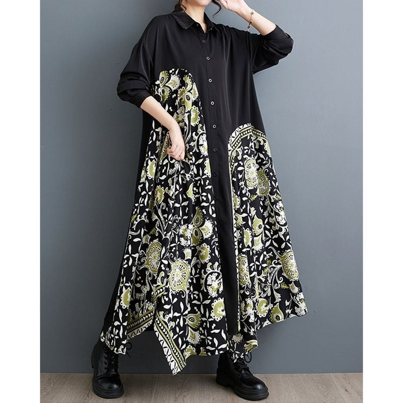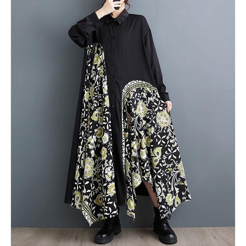 不規則なスプライシングデザインのコントラストカラーシャツドレス。
