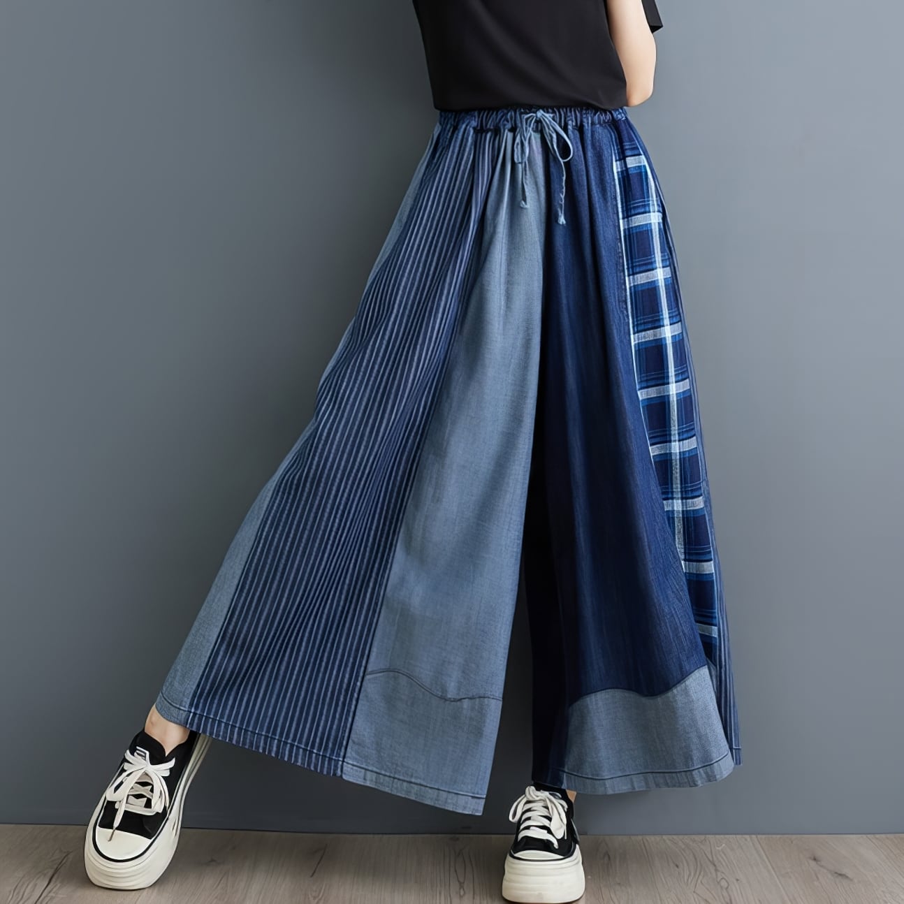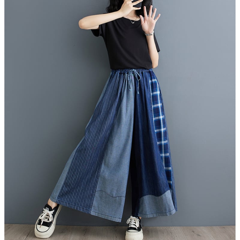 個性的なチェック柄とストライプの切替が魅力のワイドデニムパンツ。