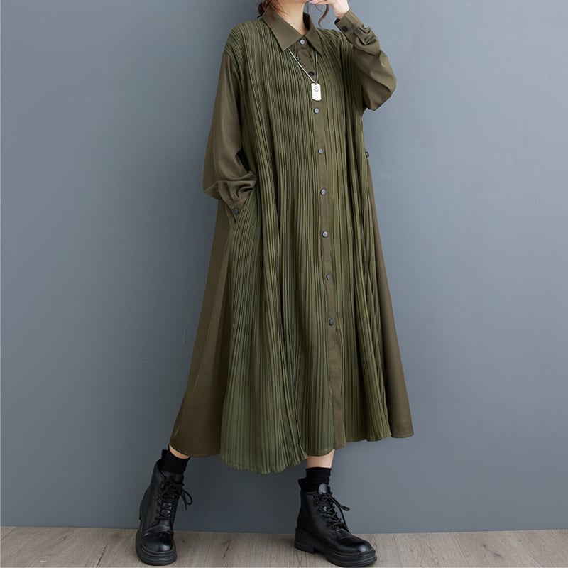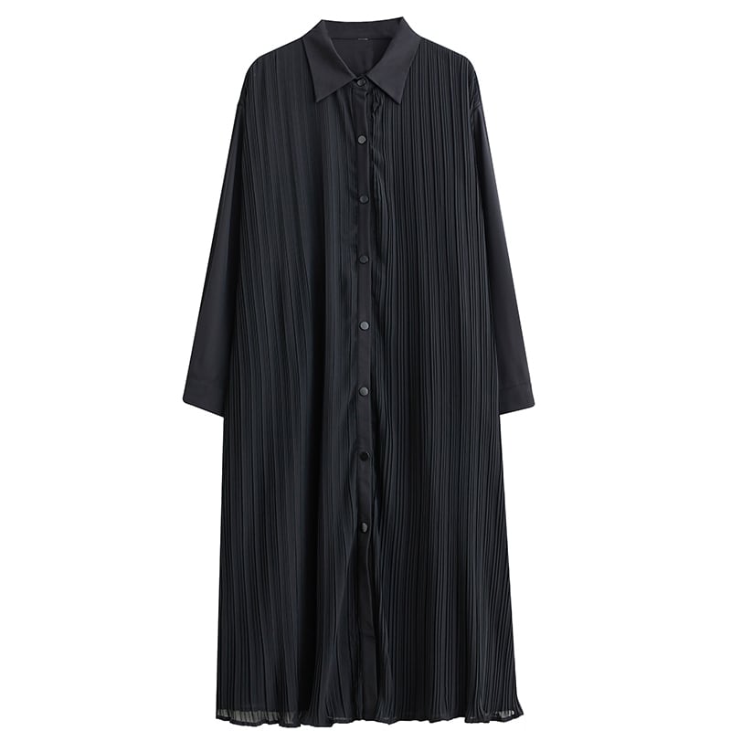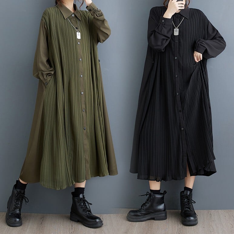 シンプルなデザインながらも、プリーツのディテールが魅力を引き立て、カジュアルな日常から特別なシーンまで幅広く活躍する一着です。