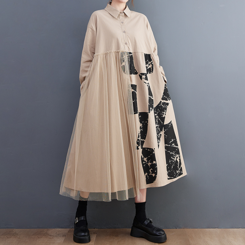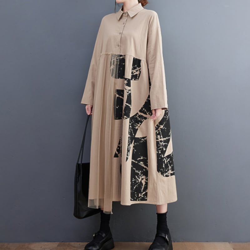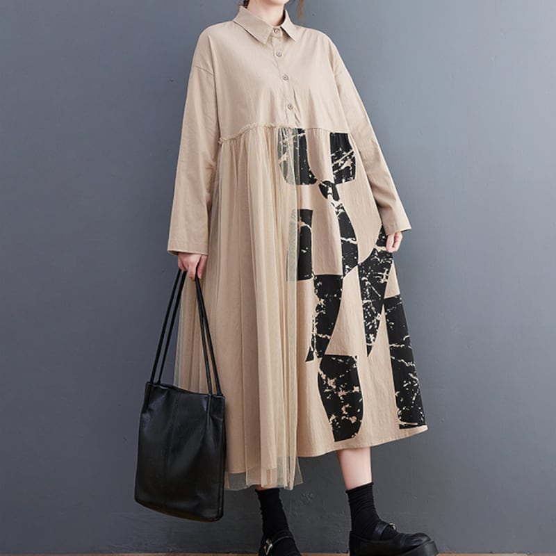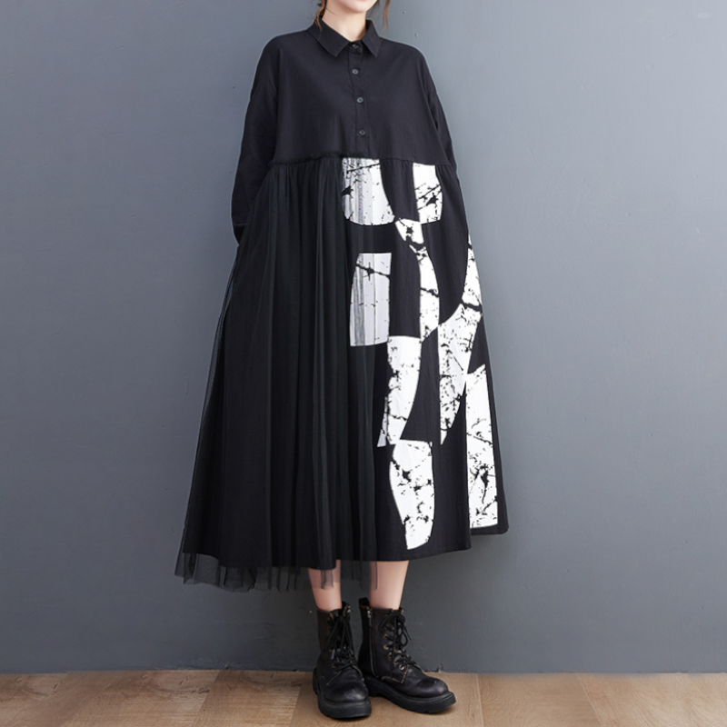 個性的でクールなプリントと、片側メッシュのアシンメトリーデザインが目を引くワンピース。