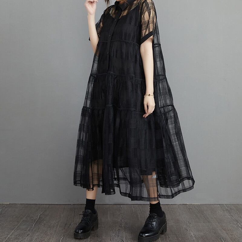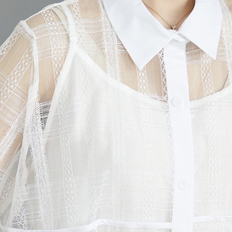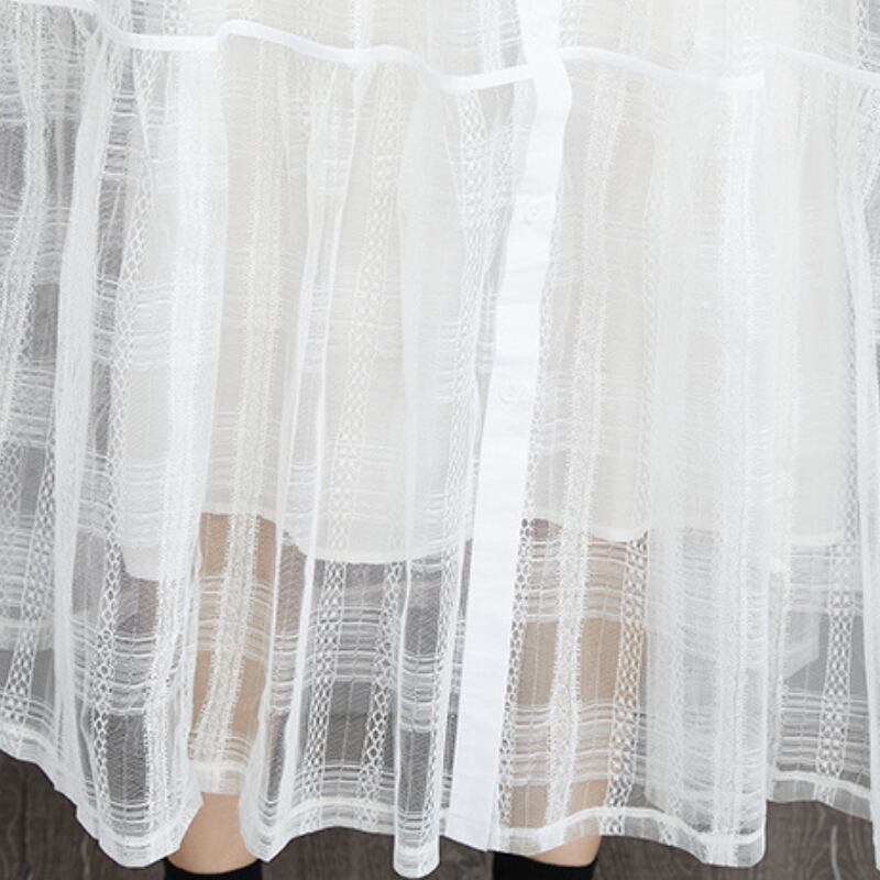 ホワイトとブラックの2色展開で、透明感のあるシースルー素材が女性らしさを引き立てつつ、軽やかな印象を与えます。