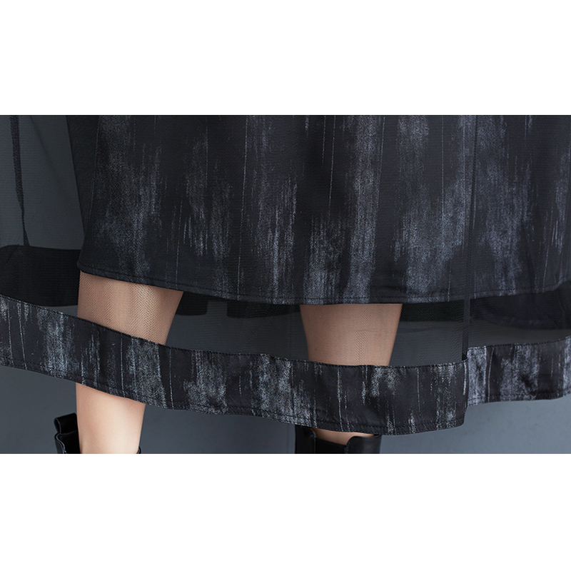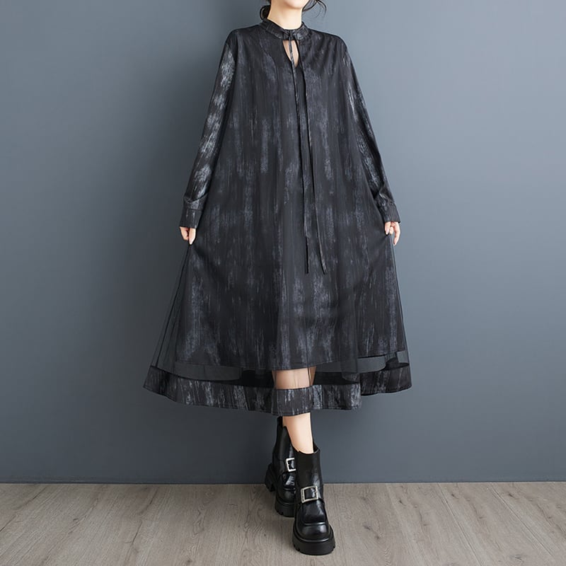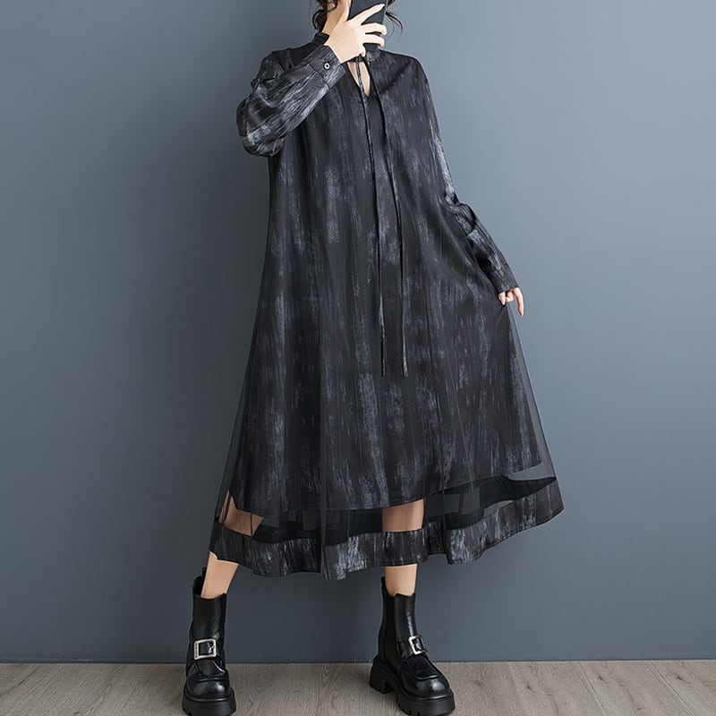 メッシュ切替がポイントのロング丈Aラインワンピース。