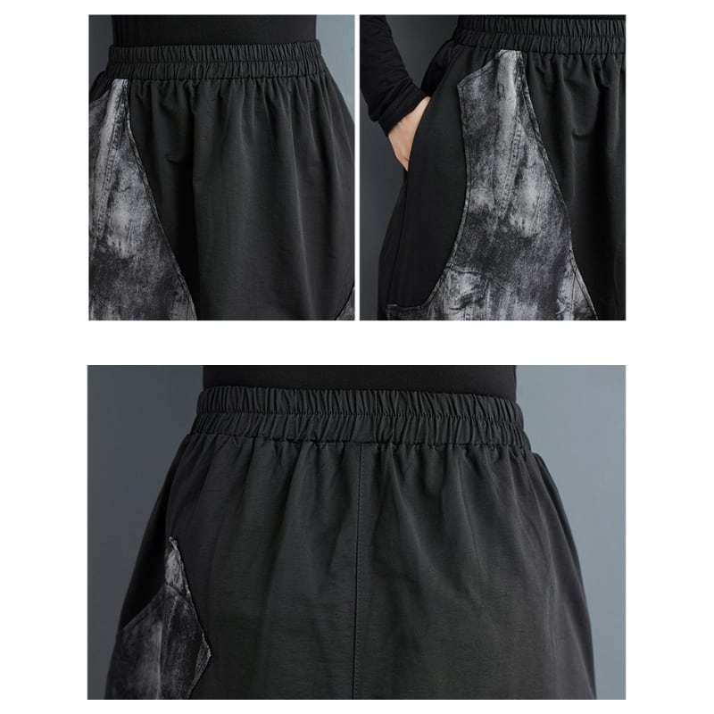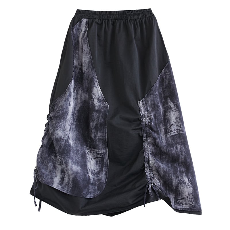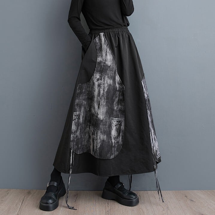 個性的なパッチワークデザインが目を引く、Aラインシルエットのロングスカート。