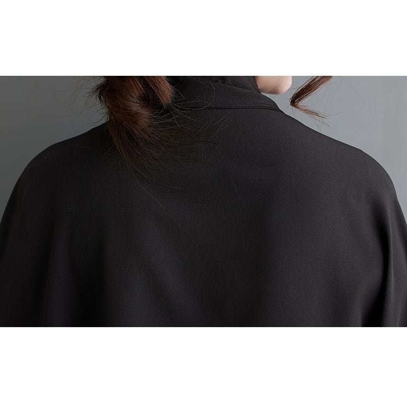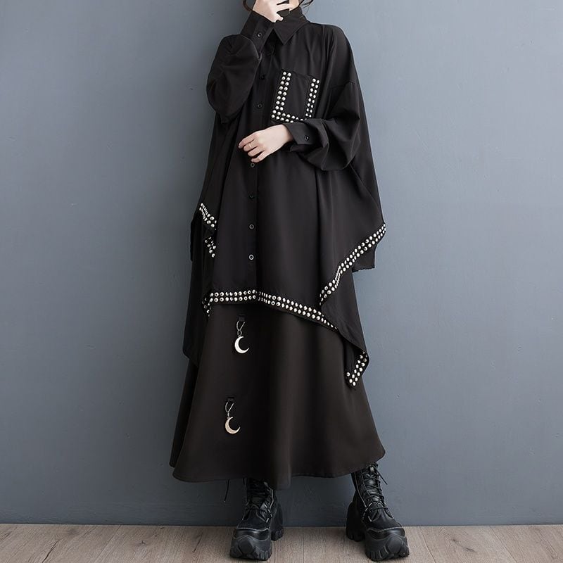 大胆なアシンメトリーヘムラインと、クールなスタッズ装飾が魅力的なロングシャツ。