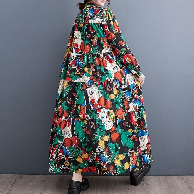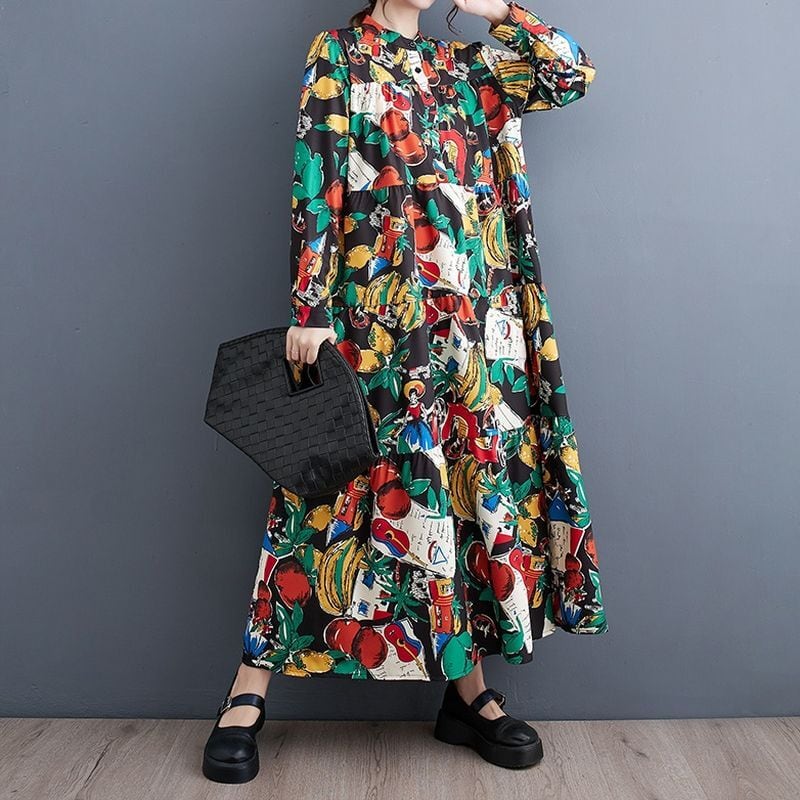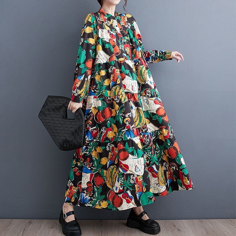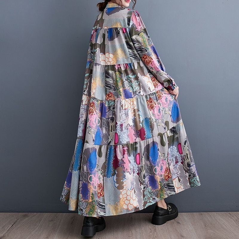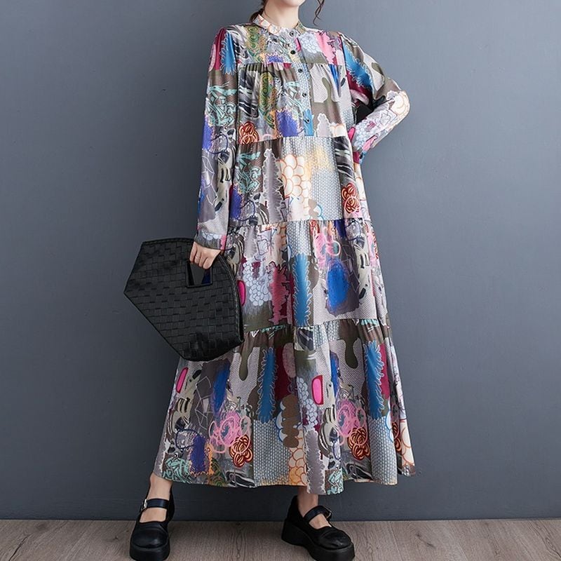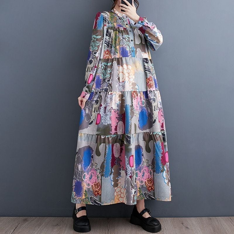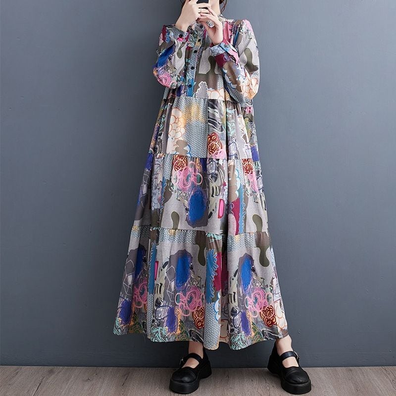 個性的なパッチワークプリントが魅力的なロングワンピース。