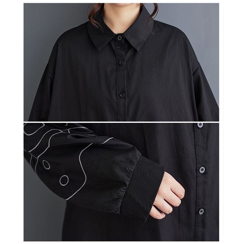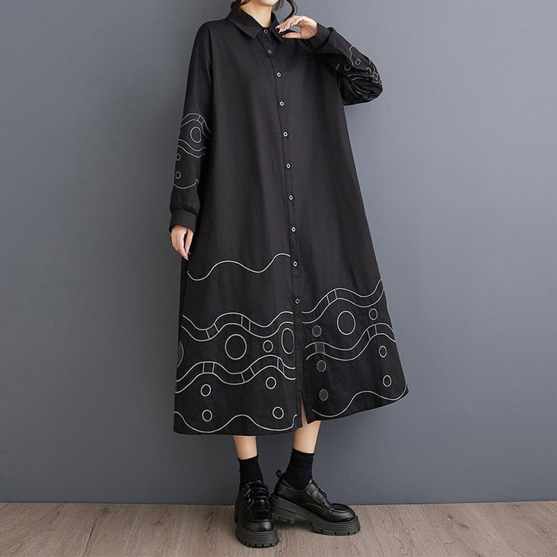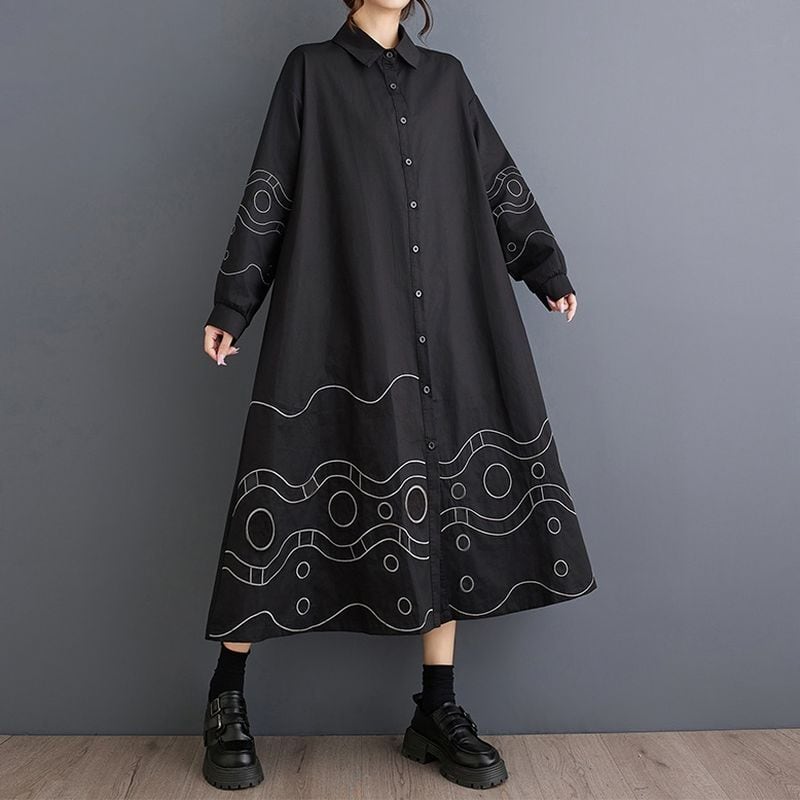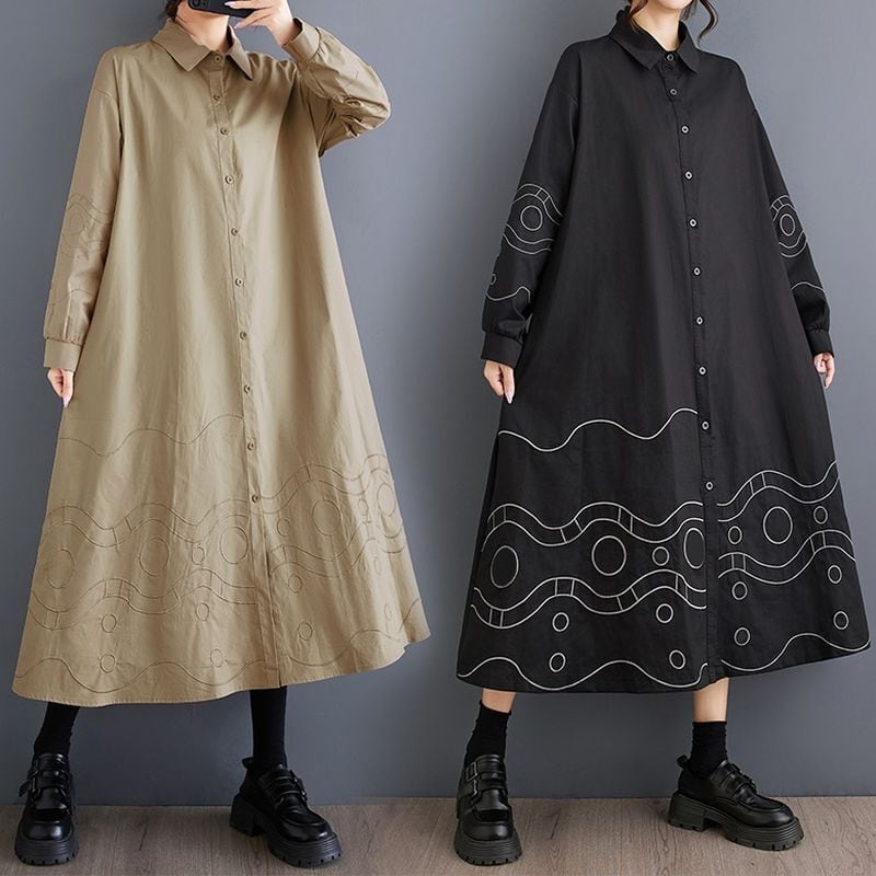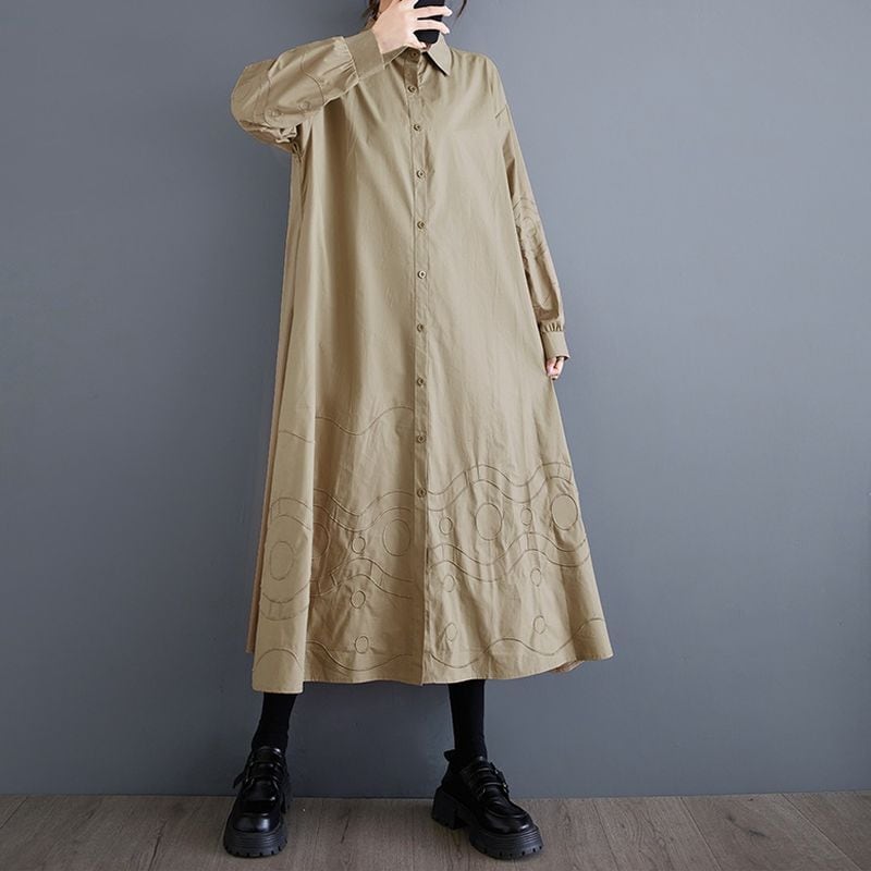幾何学模様の刺繍がアクセントになったロングシャツワンピース。