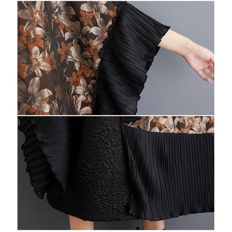 繊細なプリーツ加工が施された生地の切り替えが特徴的なチュニックワンピース。シックなブラックを基調に、落ち着いた色合いの花柄がアクセントとなり、スタイリッシュな雰囲気を演出します。