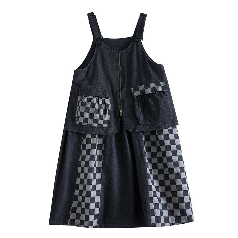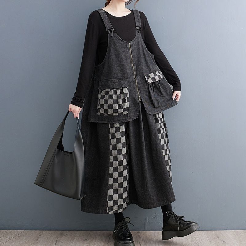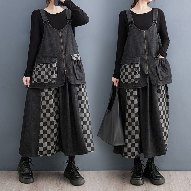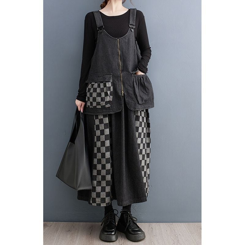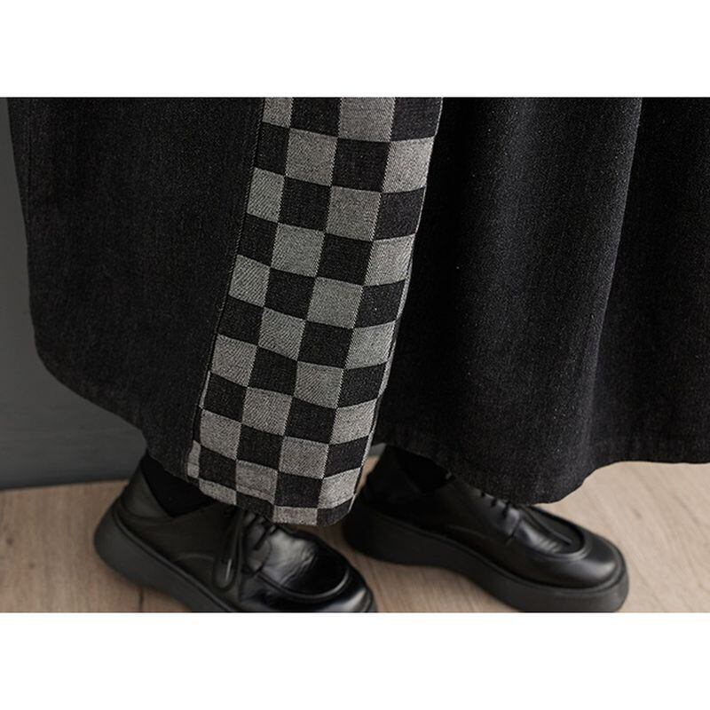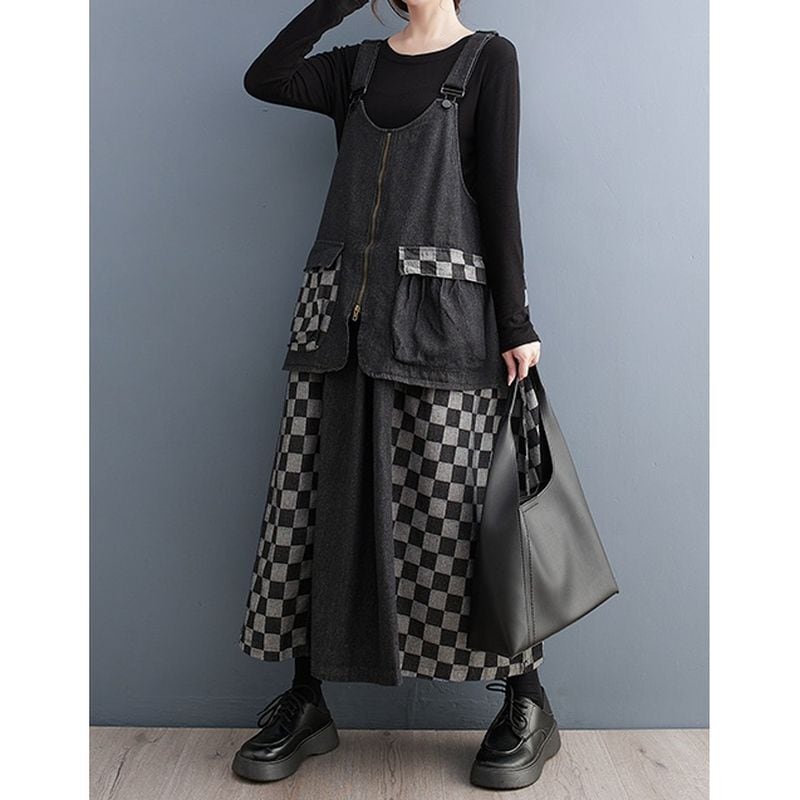 着回し力抜群のデニムサロペットスカートは、千鳥格子柄の切替デザインが個性を演出します。