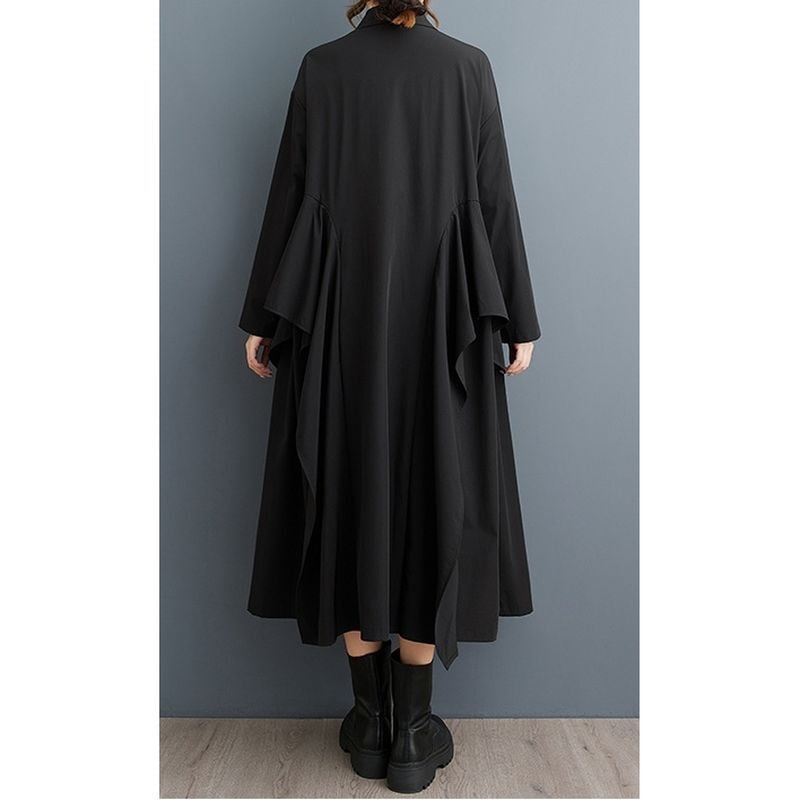 襟付きシャツのデザインに、幾重にも重なった立体的なフレアが、シンプルなシルエットながらも存在感を放ちます。