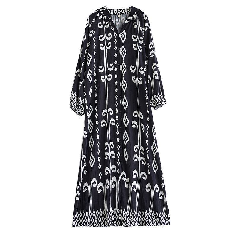 おしゃれな幾何学模様が目を惹くワンピースは、ボタンフロントのスタンドカラーデザインが特徴です。