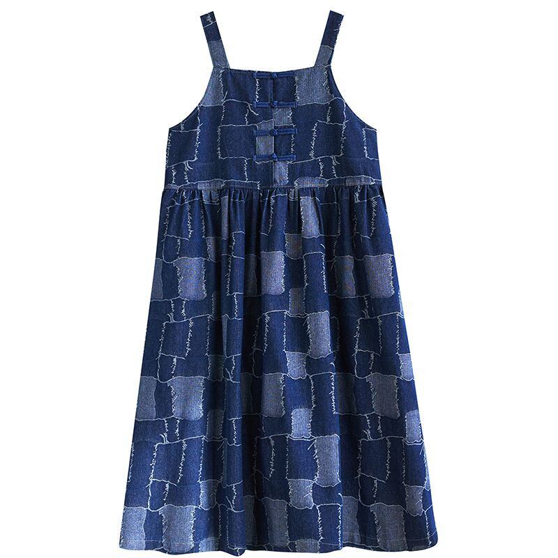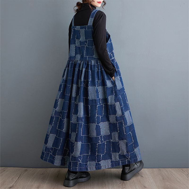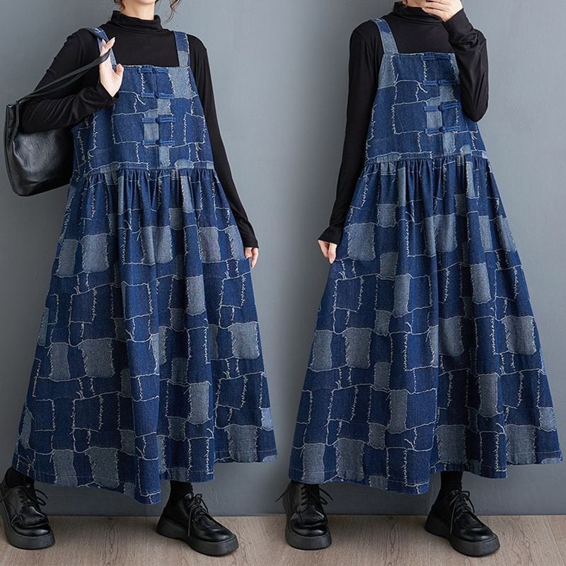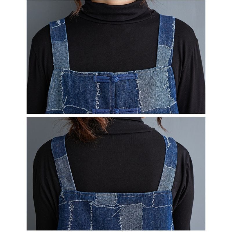 パッチワーク風のデザインが、シンプルながらも個性を演出するデニムサスペンダースカート。